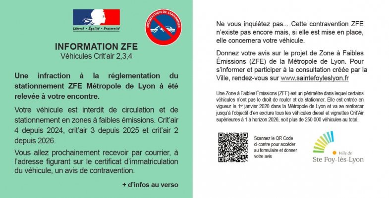 Un scénario à la "Minority Report" dont ils trouvaient néanmoins l’explication au verso du funeste document, sur lequel on pouvait lire : "Ne vous inquiétez pas, cette contravention ZFE n’existe pas encore, mais si elle était mise en place, elle concernerait votre véhicule", phrase suivi d’une invitation à exprimer son opinion au sujet de la ZFE sur le site Internet de la mairie. Evidemment, si Véronique Sarcelli -maire de Sainte-Foy-lès-Lyon- avait voulu choquer ses administrés en les alertant sur ce qui les attendait avec leur voiture, elle ne s’y serait pas prise autrement.