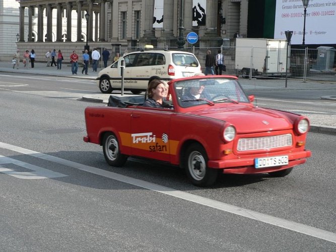 36 ans plus tard, j’aperçois le "Bär" tous les matins en arrivant au bureau, sympathique ursidé affichant son profil débonnaire et bedonnant sur le drapeau flottant au sommet du "rotes Rathaus", l’hôtel de ville de briques rouges de Berlin à laquelle il tient lieu de symbole depuis le Moyen Age. Mais après trois semaines sur place, je n’ai vu de Trabbi que les deux exemplaires servant de présentoir à des magasins de souvenirs, tristement découpés et peinturlurés, défigurés au point de rendre hypothétique une éventuelle remise à la route. Dans la rue, nichts. Pas le moindre panache de la fumée bleuâtre accompagnant normalement les éructations du bicylindre deux-temps de 594 cm³, délivrant 19 Kilowatts ou 26 chevaux dûment mesurés par le Deutsche Institut für Normung (DIN). En revanche et sur la même période, j’ai rencontré entre autres gourmandises automobiles deux Citroën 2CV en très bel état et toujours en service. Bon, je finirai tout de même bien par apercevoir l’une des petites berlines est-allemandes avec lesquelles des agences locales proposent l’émotion d’une balade pétaradante aux touristes de passage, du moins ceux qui fermeront les yeux sur une footprint carbone-et-autres-saloperies faisant passer un Porsche Cayenne Turbo pour un modèle de préservation de l’environnement.