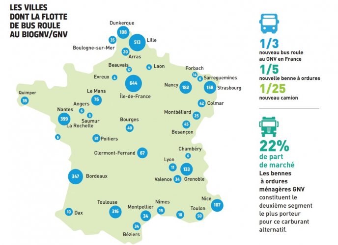 Les bus et cars au GNV réalisent la plus forte progression (+75%), grâce à l’arrivée de deux nouveaux constructeurs (Isuzu et Irizar). Des villes comme Toulon (Var), Dax (Landes) ou Saumur (Maine-et-Loire) se sont équipées de bus au gaz en 2020. En région parisienne, la RATP prévoit de disposer en 2025 de 2.200 bus biogaz et 1.500 électriques, en plus de ses 1.000 hybrides.