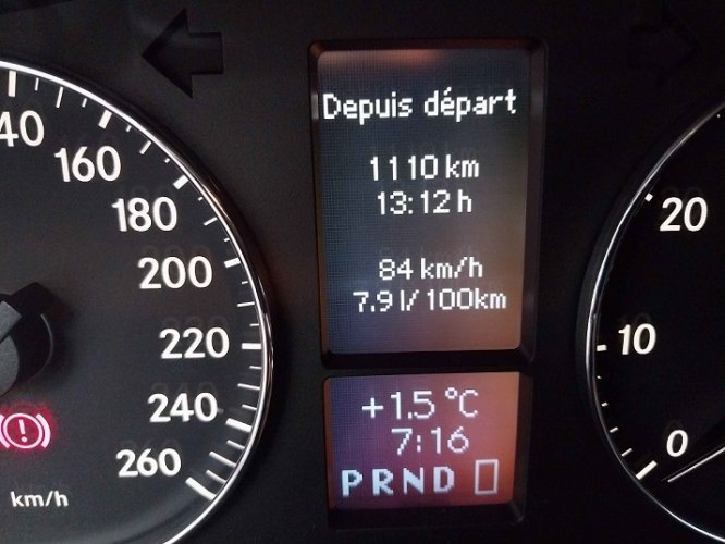 L’éphéméride de ce jour-là indique que le soleil se leva à 6h33. Mais c’est un peu avant, alors que pointaient les premières lueurs du jour que je ressentis ce sentiment victorieux procuré par la sortie de la nuit. Avec le manque de sommeil et la fatigue qui finit tout de même par se manifester, il s’en est fallu de peu pour que je ne m’identifie à ces pilotes des 24 heures qui voient poindre l’aube comme une délivrance. Quoiqu’il en soit, j’ai coupé le moteur pour de bon à 6h50 avec un sentiment de mission accomplie, au terme d’un périple épique de 1110 km réalisés en 16h26, dont 13h12 au volant. Et si les modestes 84 km/h de moyenne témoignent des conditions adverses que j’ai rencontrées, ça ne devrait pas m’empêcher de recevoir bientôt une photo souvenir, du moins si j’en crois la vive lumière qui m’a fait sursauter dans une zone à 100 km/h où je me suis "oublié" à 110.