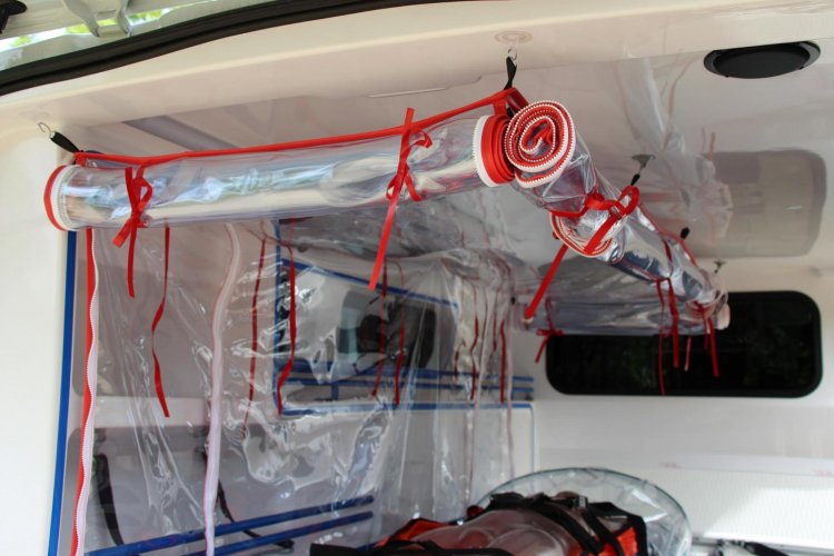Protect Shell vient se fixer au pavillon de toit des ambulances de tous types (toutes marques, tous modèles A, B et C, neuf ou retrofit) et isole le patient du reste de la cellule habitable. Le montage et le démontage ne nécessite aucun outil et peut être réalisée par le client sans effort particulier. Une fois en place, la cellule dispose d’un réglage en hauteur et s’adapte parfaitement la hauteur utile disponible à l’intérieur du véhicule. Toutes les faces peuvent être ouvertes et facilement enroulées sur elles-mêmes : l’installation du patient et du brancard reste très facile.