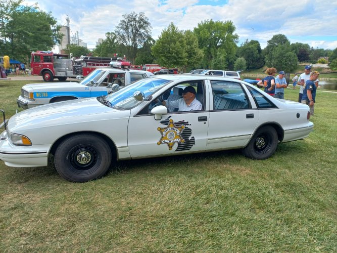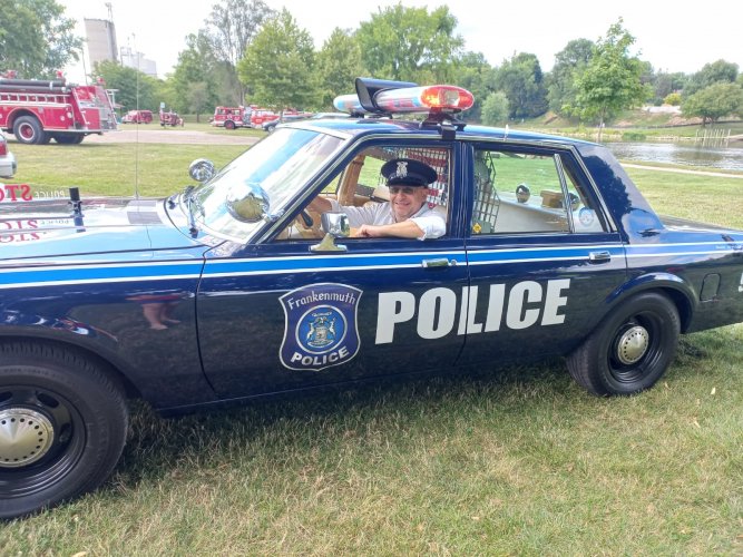 Dans la famille des gyrophares, on ne trouve cependant pas que les combattants du feu. Vous avez demandé la Police ? ne quittez pas et meet Ross. Véritable ex-flic, Ross est tel que vous pouvez l’imaginer avec une paire de Ray-Ban Aviator à la monture dorée, sa moustache soigneusement taillée et une casquette vissée sur la tête témoignant d’un passé également militaire. La passion de Ross, ce sont les 6 voitures de police qu’il fait régulièrement rouler à l’occasion d’évènements comme celui de Frankenmuth, et qu’il a parfois sauvées d’un sort funeste, comme la Ford LTD Crown Victoria 1991 récupérée juste avant qu’elle ne subisse les affres du broyeur. Une auto en parfait état de marche malgré une vie particulièrement active, puisqu’ayant servi de véhicule d’instruction à de jeunes recrues de la Police après plusieurs années à patrouiller dans les rues d’une ville du Texas, et qui vient de participer au tournage d’un film d’épouvante qu’on verra sur les écrans en 2023.