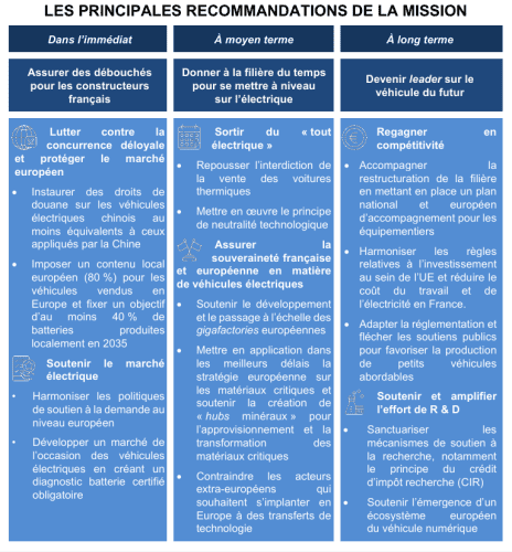 Le rapport comprend 18 "mesures d'urgence", dont l'imposition d'un contenu local à 80% pour les véhicules vendus en Europe, avec un objectif d'au moins 40% de batteries produites localement en 2035.
